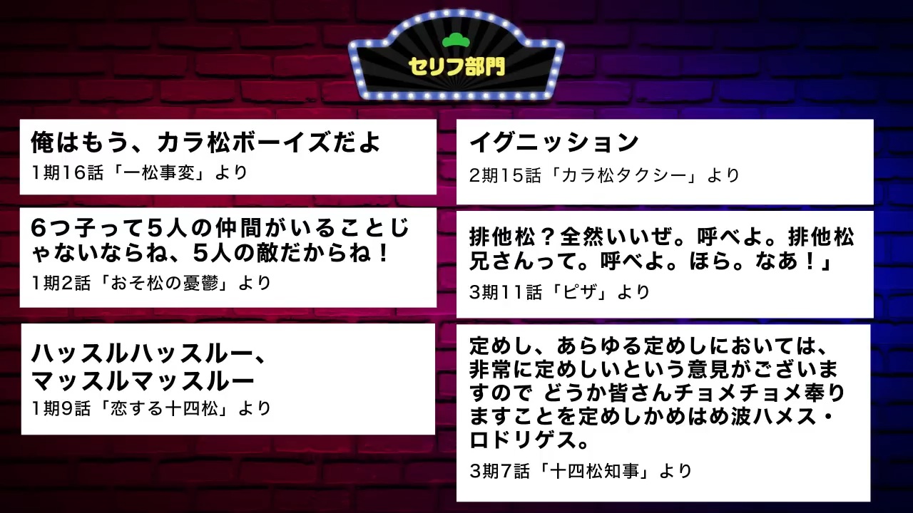 이번에도 여전한 쥬시마츠 성우 오노 다이스케 까기(허슬허슬 머슬머슬을 성우 본인도 유행어로 밀던 얘기 등)나 쥬시마츠 지사의 대사(사다메시~), 카라마츠의 이그니션 대사가 성우진에게 반응이 좋았다, 그 뒤 카라마츠가 가타카나 대사르르 많이 치지 않았나 정도의 토크. 이그니션이 1위가 되지 않을까 점치는 가운데